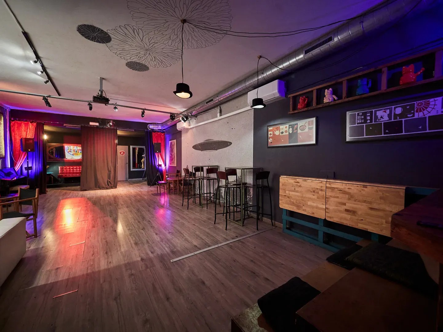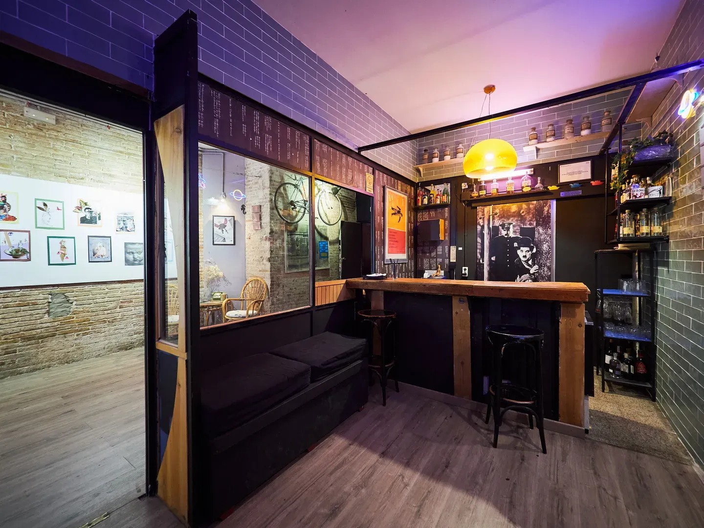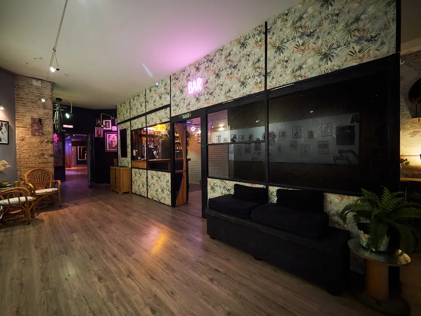 Distribuido en dos zonas diferenciadas —una sala de exposición con servicio de bar y una segunda sala para eventos—, este venue ofrece un entorno íntimo y auténtico, perfecto para eventos pequeños, culturales o alternativos en Barcelona.