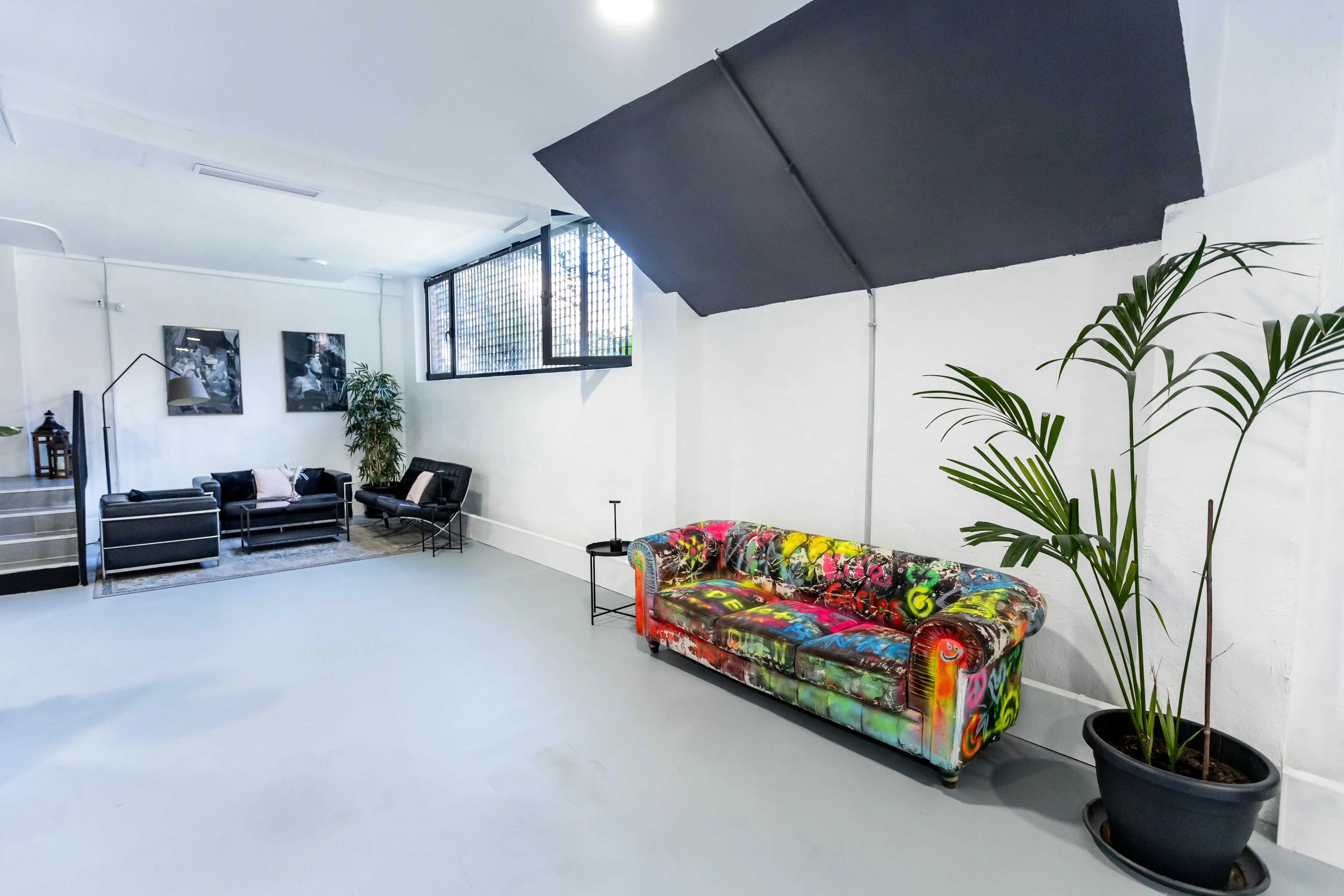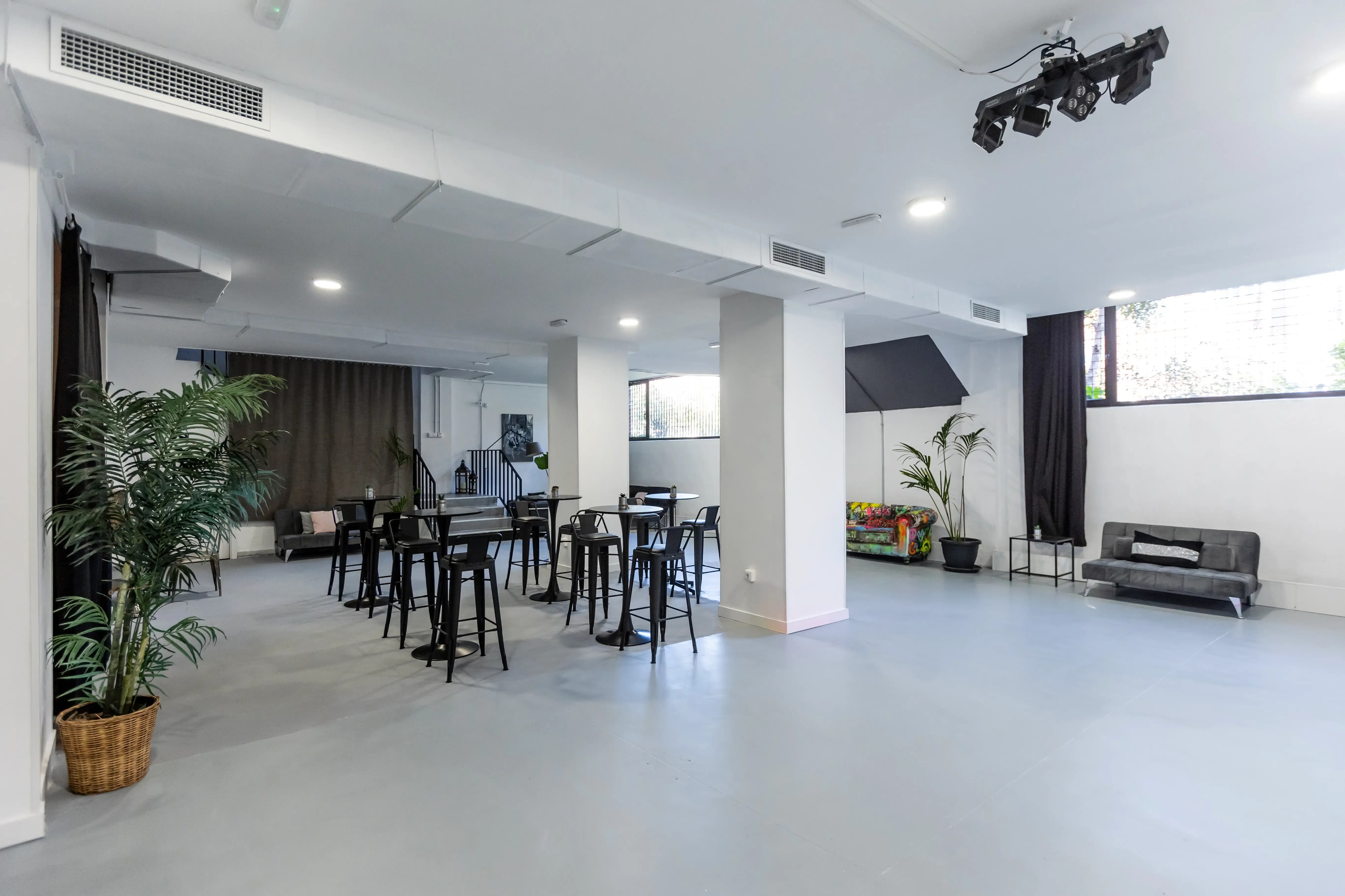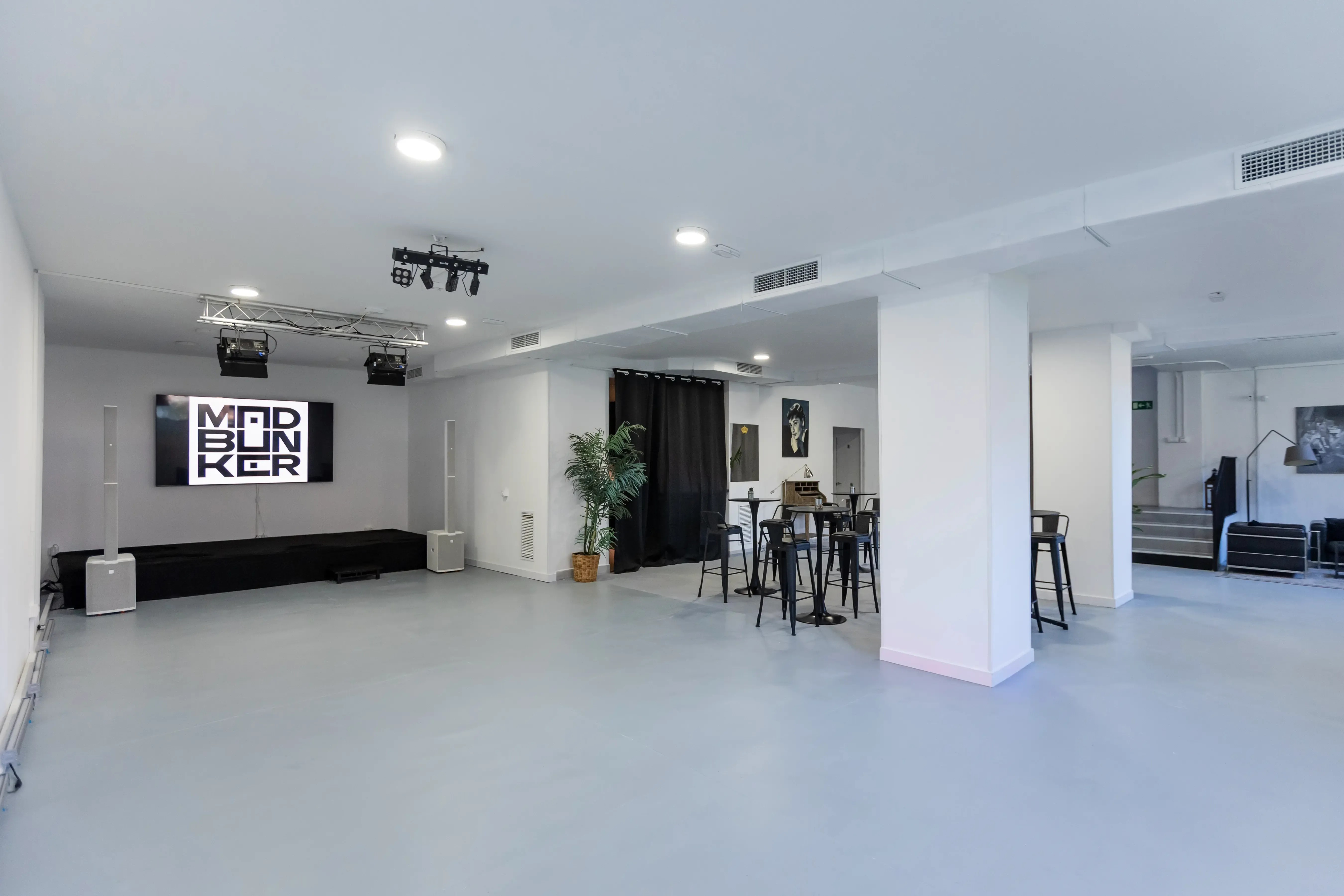 Mad Bunker es un espacio para eventos en Madrid diseñado para impulsar la creatividad y la personalización. Ubicado a pocos minutos de Plaza Castilla, este venue moderno y polivalente ofrece dos plantas diáfanas con luz natural y techos altos, lo que lo convierte en el lugar ideal para reuniones de empresa, workshops, presentaciones de producto, rodajes, eventos corporativos o experiencias de marca.