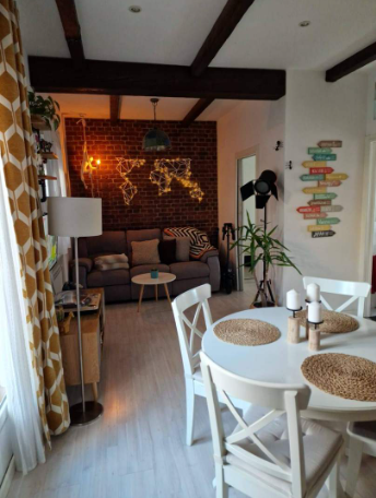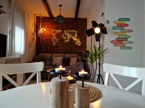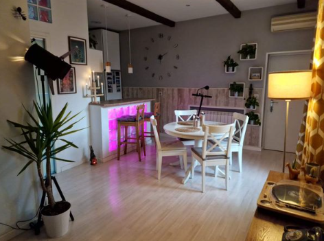 Pequeño apartamento con un dormitorio y una terraza con más de 30 metros. Es un segundo piso sin ascensor. Cocina americana y mucha luz natural. Techos altos y decoración muy cuidada con toques nórdicos, rústicos e industriales. Terraza con dos pérgolas de madera y brezo con bastante vegetación. Una iluminación tanto eléctrica como de velas, muy estética y relajante. Perfecto para eventos como reuniones, cumpleaños y producciones, entre otros.